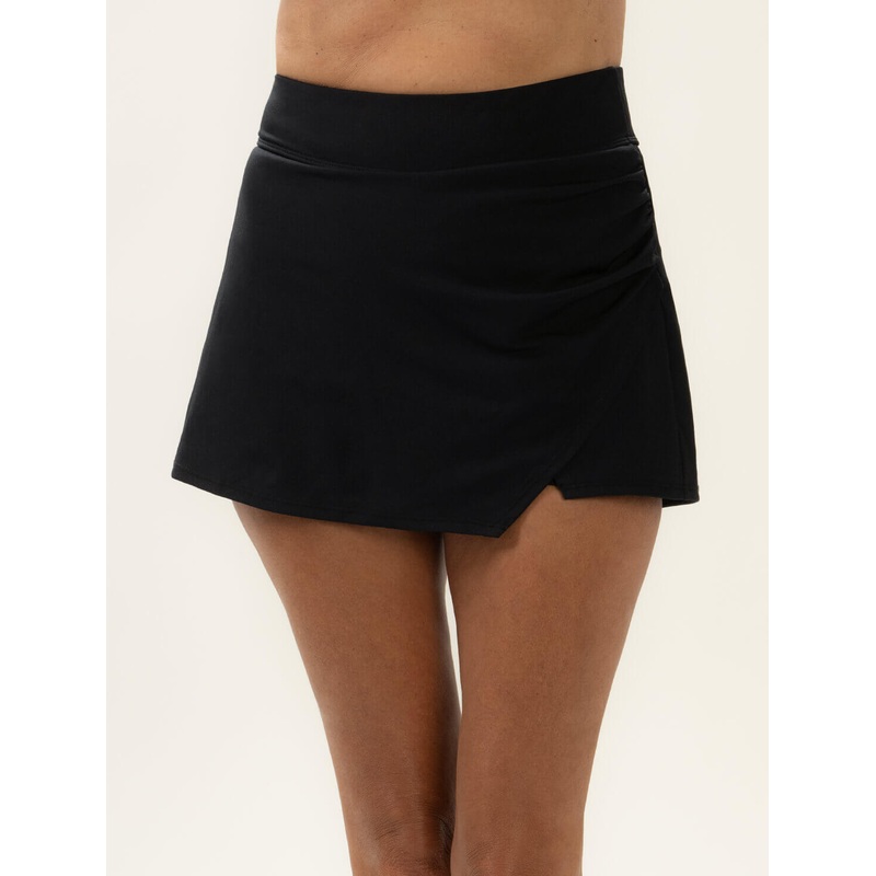Elevate your swimwear collection with the black high waisted wrap front swim skort, a versatile piece designed to take you effortlessly from the gym to the water. The two-inch supportive waistband, lined with power mesh, ensures a comfortable fit that stay