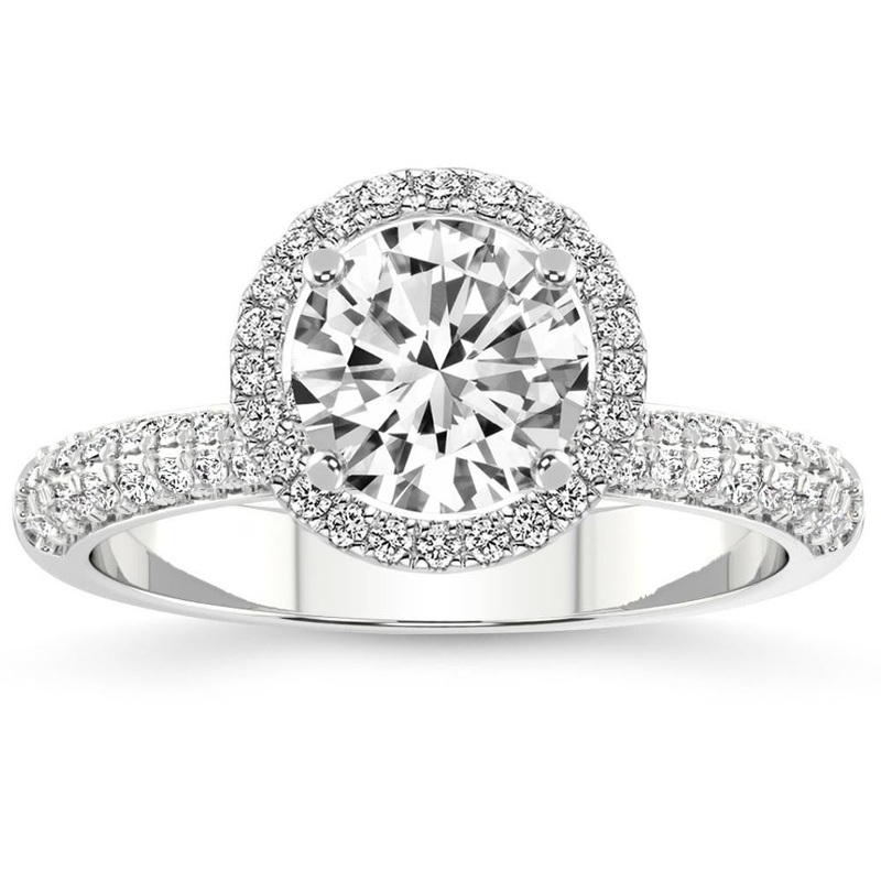 Classic women's ring features a 1/2 center round brilliant cut genuine lab grown diamond and 56 round pave side stones. The diamond is prong set in solid gold high polished halo style sparkly mounting. Item #: ENG802Width: 3 mmWeight: 4 gMetal: 10k White G