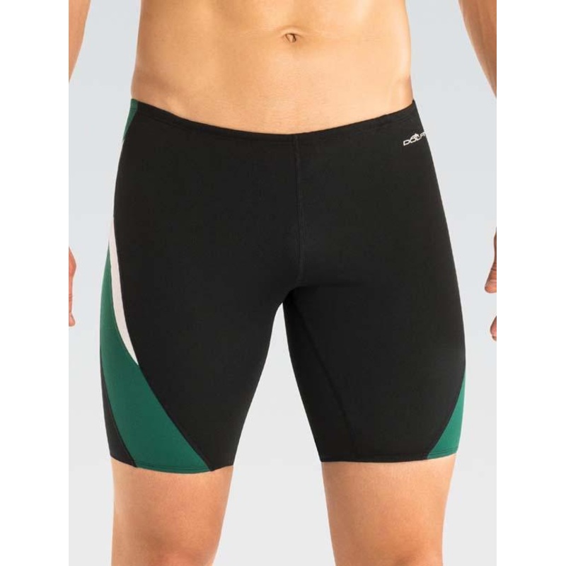 STYLE: Reliance color block jammer. GREAT DETAILS: Be confident and comfortable in our color block jammer in black with green and white sides. This chlorine-resistant suit provides comfort to perform with freedom of movement. PERFECT FIT & FEEL: Made with