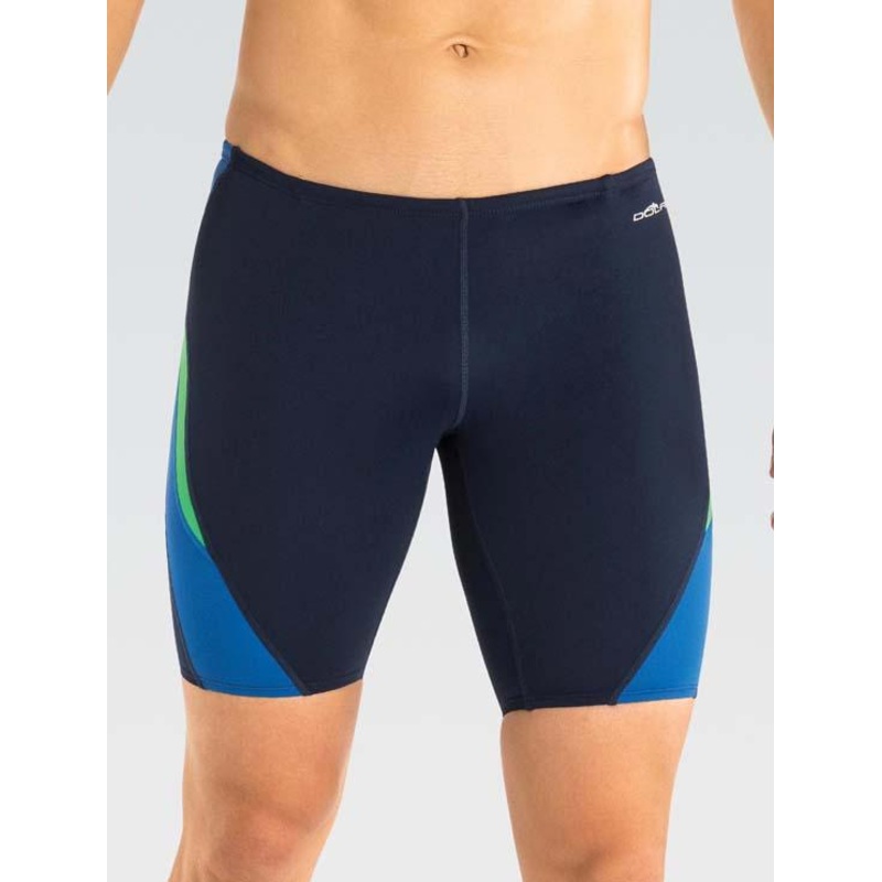 GREAT DETAILS: Stay confident in the pool or on the deck in our color block jammer in navy with blue and green sides. This chlorine-resistant suit provides comfort to perform with freedom of movement.