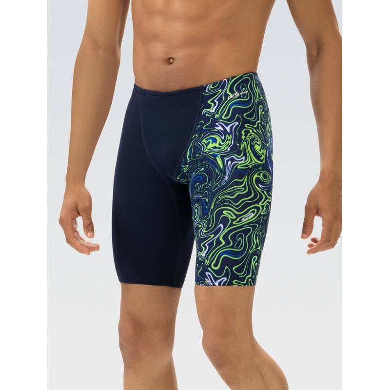 Engineered for minimal drag, the jammer’s shape retention ensures optimal performance, while UV protection keeps you shielded from the sun. The captivating Forcefield print in blue and green with solid navy delivers a distinctive look, and the drawcord provides secure fit. Dive into success with this high-performance jammer, enhancing your competitive swim with style.