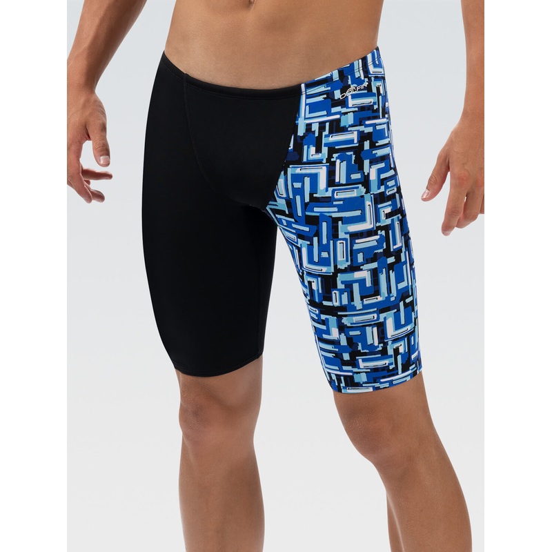 Race ahead with confidence in the Reliance Men's Asymmetrical Jammer, featuring a Bionic Blue geometric print. Engineered from durable two-way stretch fabric, this jammer provides vibrant color retention, breathability, and superior resistance to chlorine