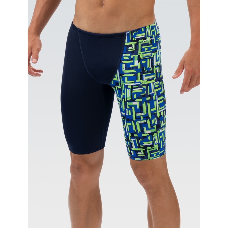 Engineered for minimal drag, this jammer features exceptional shape retention for optimal performance during every swim and has been rigorously tested for over 300 hours to ensure durability. With UPF 50+ protection shielding you from harmful UV rays, this high-performance jammer combines functionality and style, offering a secure fit with its adjustable drawcord. The striking blue and green colorway paired with solid navy enhances visibility and adds a distinctive flair to your competitive gear, empowering you to dive into success with confidence.