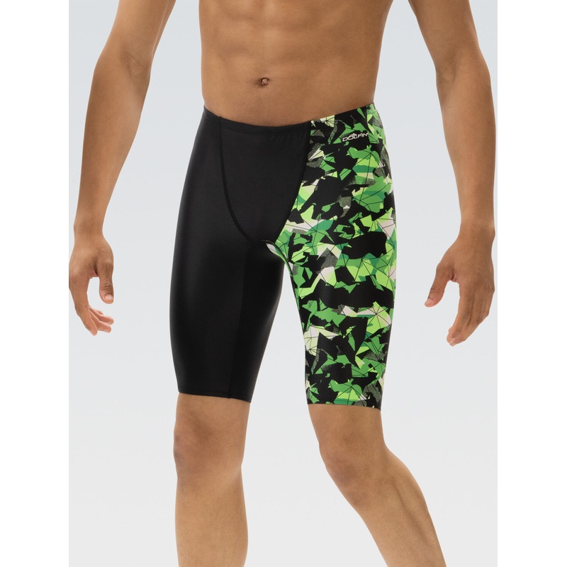Limited Availability, get it while it lasts!Conquer your swim meets with the XtraSleek Men's Asymmetrical Jammer in the vibrant Implode Green design. This new camo print with a digital ombre effect offers 2-way stretch fabric with shape retention that ensu