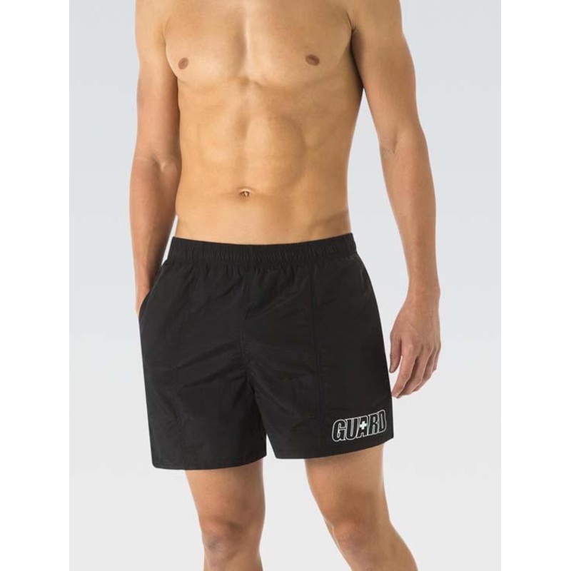 STYLE: Guard Solid Water Shorts. GREAT DETAILS: One of our best sellers, this water shorts in solid black with a 5 inch inseam gives you freedom of movement while on duty. With side pockets and an elastic waist. A great staple, shorts you will find yoursel