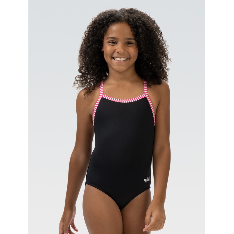Elevate your little swimmer's wardrobe with the Uglies Girls' Black Criss-Cross Back One Piecea classic staple that combines style and functionality! This timeless black suit features a chic criss-cross back design, providing both a secure fit and a fun tw
