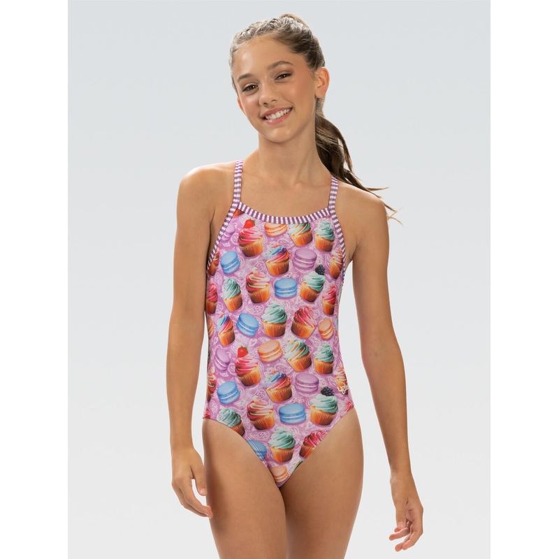 Limited Availability, get it while it lasts!Indulge in the deliciously good looks of the Uglies Girls' Bon Appetit Criss-Cross Back One Piece Swimsuit! Featuring a print inspired by macarons on a picnic blanket background, this swimsuit is a sweet blend of