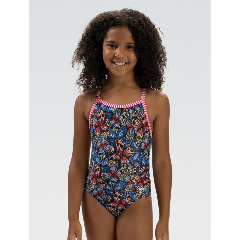 Limited Availability, get it while it lasts!Let your little swimmer flutter into fun with the Uglies Girls' Flutter By Criss Cross Back One Piece! This vibrant suit showcases a delightful design bursting with color and energy, perfect for girls who love to