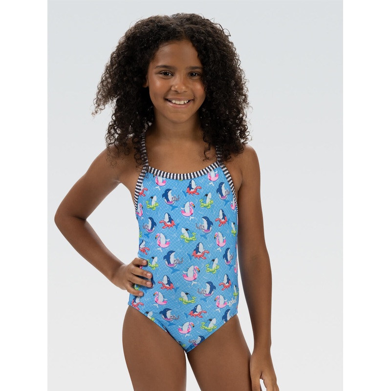 Limited Availability, get it while it lasts!Get ready to make a splash with the Uglies Girls' Fin Floats Criss-Cross Back One Piece, featuring a playful design of sharks lounging on colorful pool floats! This suit is perfect for little ones who love to rid