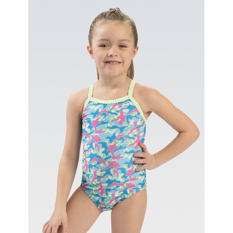We want your little swimmer to be comfy and safe, so this one piece swimsuit features an easy to wear, modest leg cut, vibrant colors that are easy to see in the water, and UPF 50+ sun protection for even the brightest days. And theres plenty of bright days ahead in this little girls swimsuit!