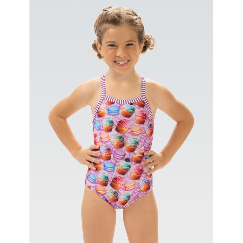 Limited Availability, get it while it lasts!Ignite your child's imagination with the captivating Little Dolfin Girls' One Piece Swimsuit in Bon Appetit print. This charming swimsuit showcases delightful macarons on a vivid background, invoking a sense of s