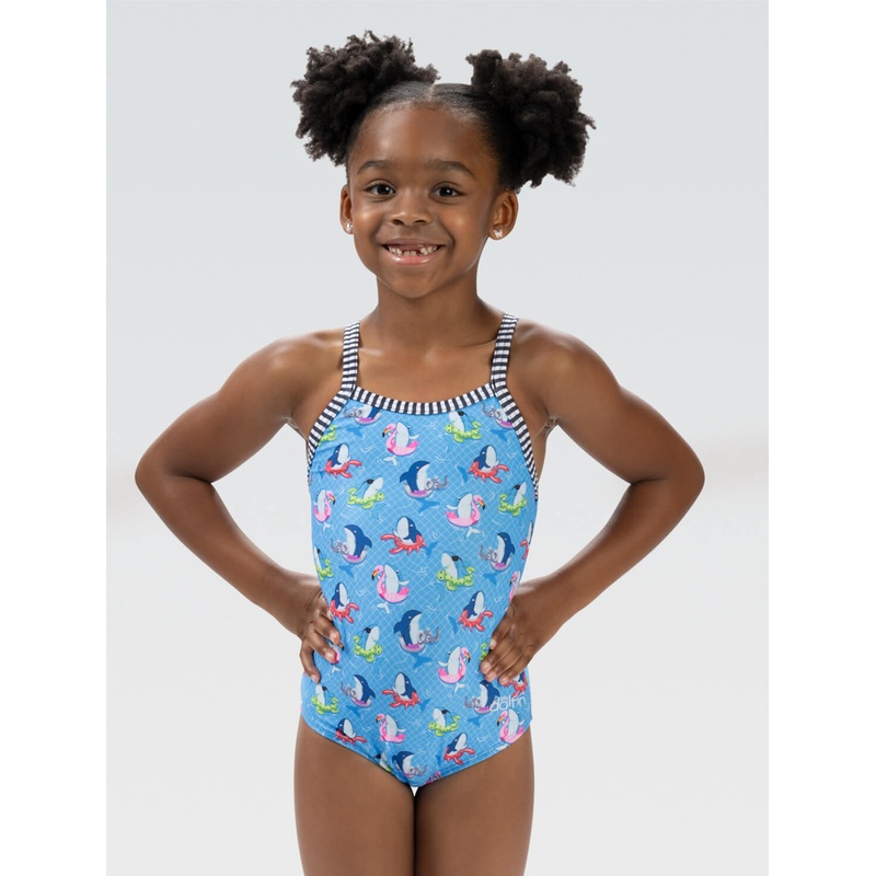 Limited Availability, get it while it lasts!Make a splash with the Little Dolfin Girls' Fin Floats One Piece! Adorned with a whimsical print featuring adorable sharks floating in colorful pool toys, this swimsuit is perfect for your little ocean explorer.
