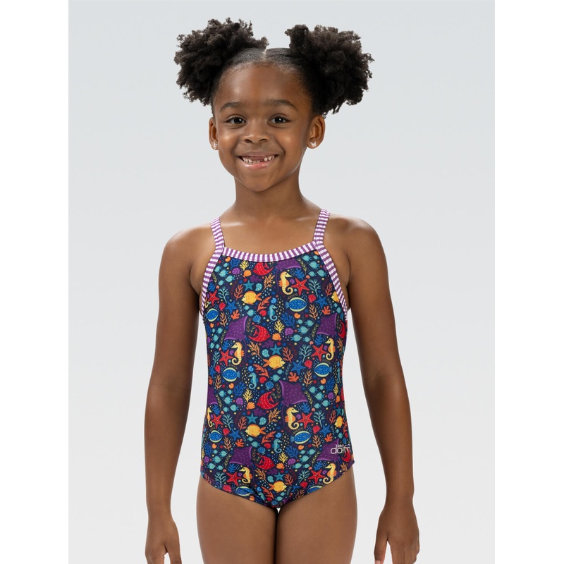 Limited Availability, get it while it lasts!Dive into a world of fun with the Little Dolfin Girls' Little Fish One Piece! Bursting with vibrant sea creatures, this playful swimsuit is like a party under the sea, ensuring your little one stands out like a s