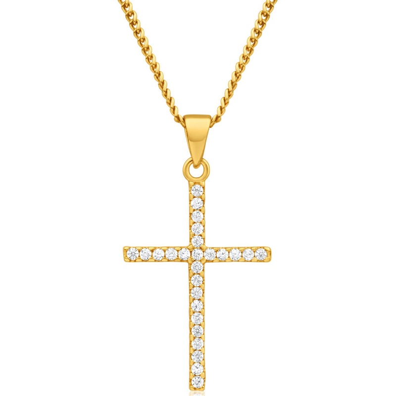 This cross pendant is sure to sparkle.The9ct yellow gold pendant can be layered or worn alone.