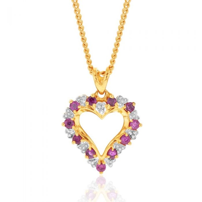 Soft, feminine and romantic, this Natural Ruby and Diamond Heart pendant is a beautiful addition to your jewellery collection. The ruby and diamond pattern brings the colour of nature to life and is a bewitching combination. Crafted from sumptuous 9ct yellow gold, this pendant is enchanting, gorgeous and must have for those seeking a statement jewellery piece.