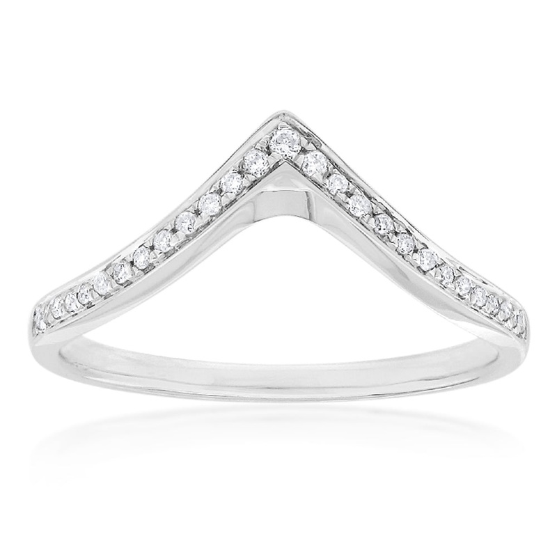 This wishbone ring resembles a symbol of love. Due to its V shape, its very easy to wear another ring before it, where it can sit comfortably on your finger. Shimmering with 27 Brilliant Diamonds set in 9ct White Gold, the ring can complete the bridal set