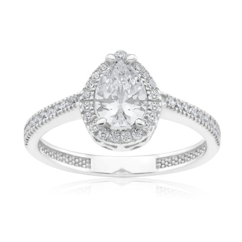 Sparkle the night away in this enchanting Zirconia Pear Shaped Halo Ring. Crafted from sumptuous 9ct white gold and featuring shiny zirconias arranged in an alluring pear shaped halo structure, this ring is sure to bedazzle near and far. Pair this ring wit