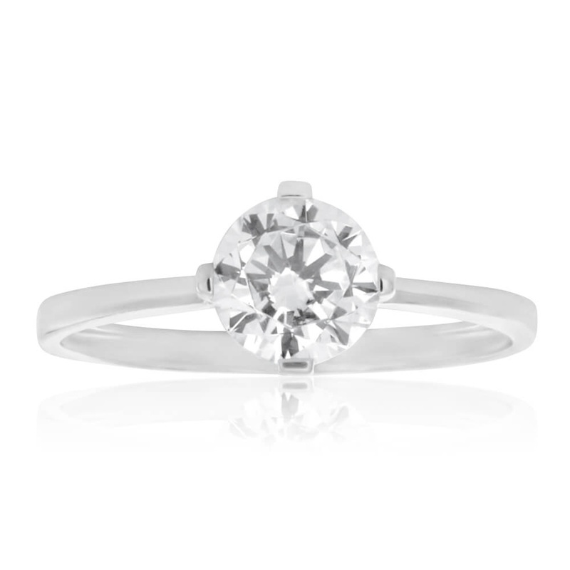 Choose this beautiful 9ct White Gold Zirconia Rounded Ring and let it light up your attire. Its brilliant cut zirconia is held high with a 4-prong setting, emphasised by the slim white gold band. Zirconia stones are known for their similarities to diamond,