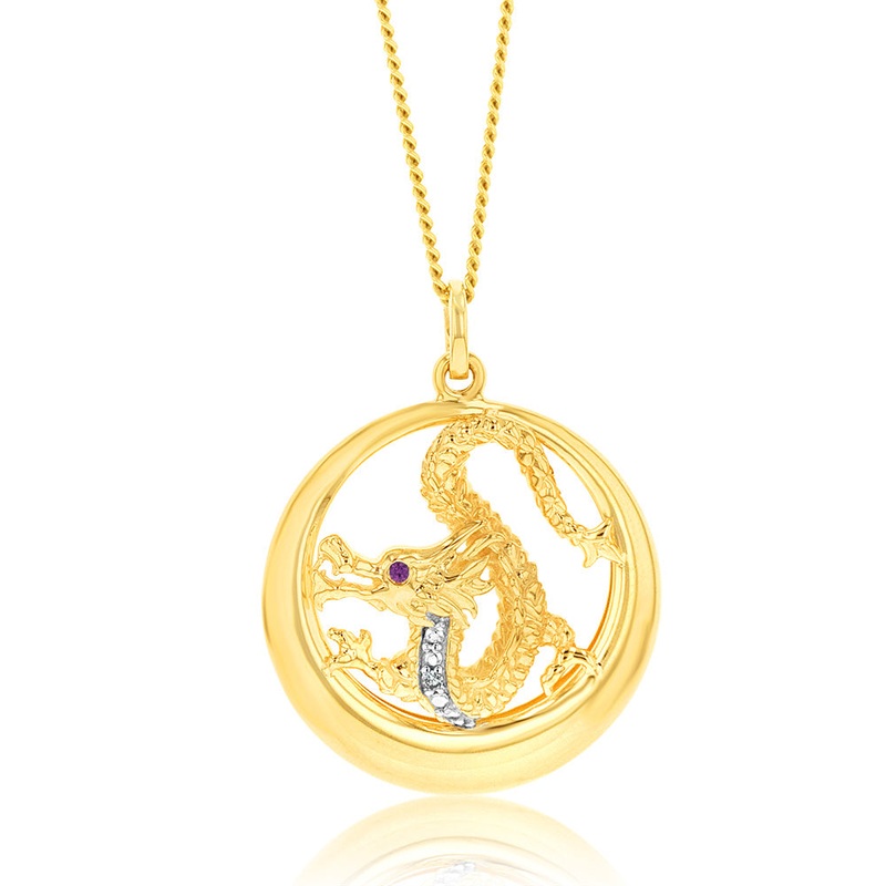 9ct Yellow And White Gold Created Ruby And Diamond Dragon Pendant
