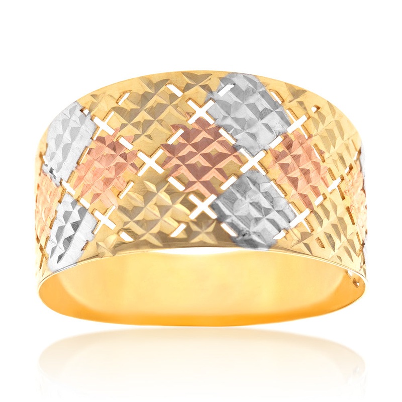 Make a bold statement with our 9ct Yellow and White Gold Patterned Broad Band Ring. Crafted with meticulous attention to detail, this ring showcases a striking combination of yellow and white gold, creating a captivating contrast that catches the eye. The