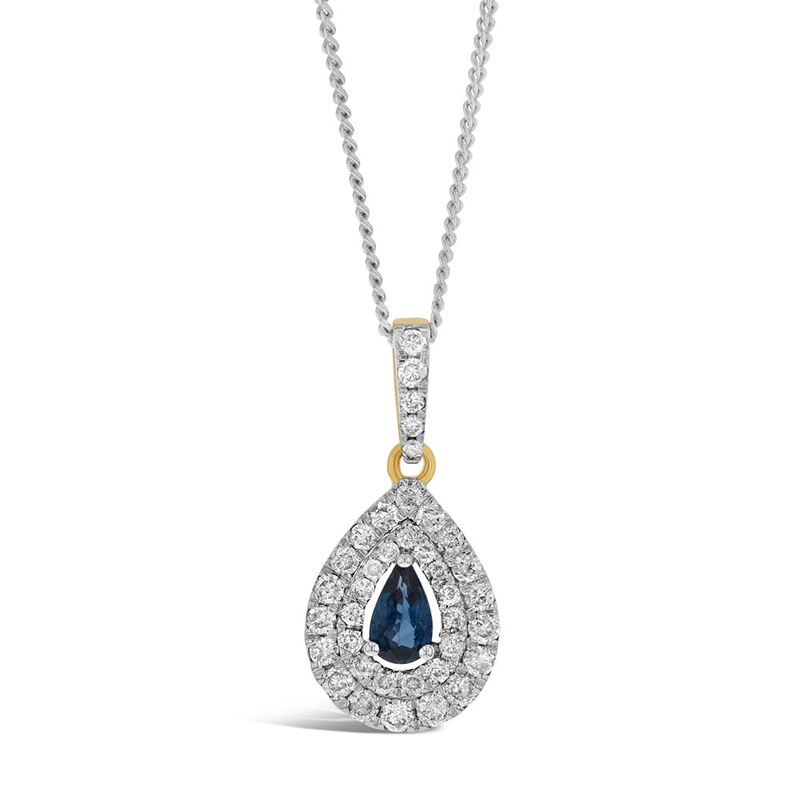 9ct Yellow Gold 0.24ct Natural Blue Sapphire and 0.39ct Diamond Double Halo Pendant