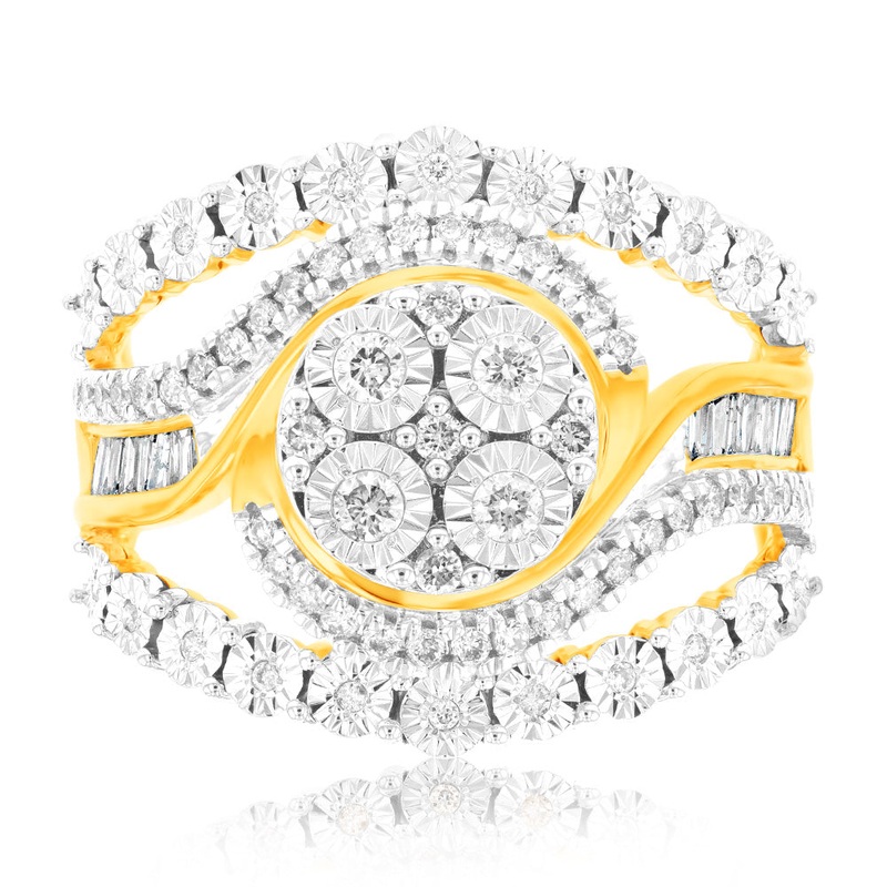 Its all or nothing with this stunning 9ct Yellow Gold Carat Diamond Big Look Dress Ring. Boasting a glorious landscape of diamonds securely set in yellow gold, this dress ring is demanding a big night out. Each diamond is cut with fine precision, highlight