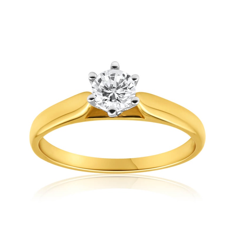 This stunning solitaire diamond ring is simple and classic. With 1 brilliant cut diamond in a 6 claw setting, the luscious ring, in 9ct yellow and white gold, is timeless.