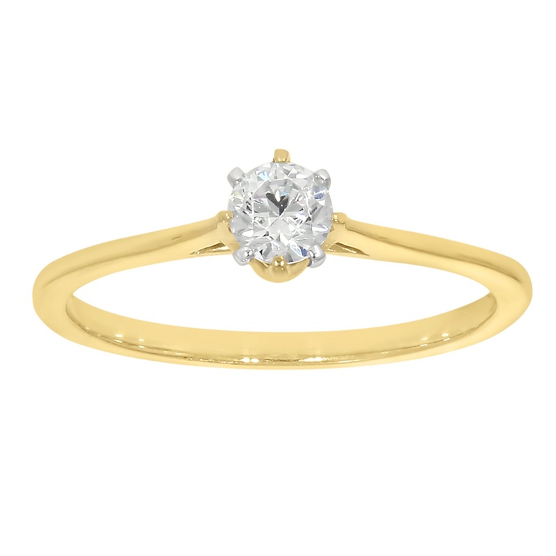 Classic, but always beautiful. This 9ct Yellow Gold 1/4 Carat Diamond Solitaire Ring has amazing vintage styling, with a single brilliant cut diamond solitaire on display. This lush diamond is held in both yellow and white gold, for a unique finish. The ring shank is shaped beautifully from 9ct yellow gold, for a delicate look with high durability.