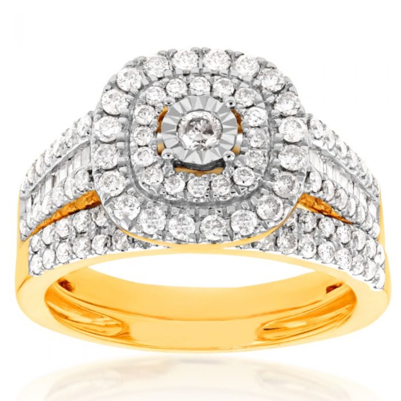 9ct Yellow Gold 1 Carat Diamond Cushion Shape Cluster Bridal 2-Ring Set