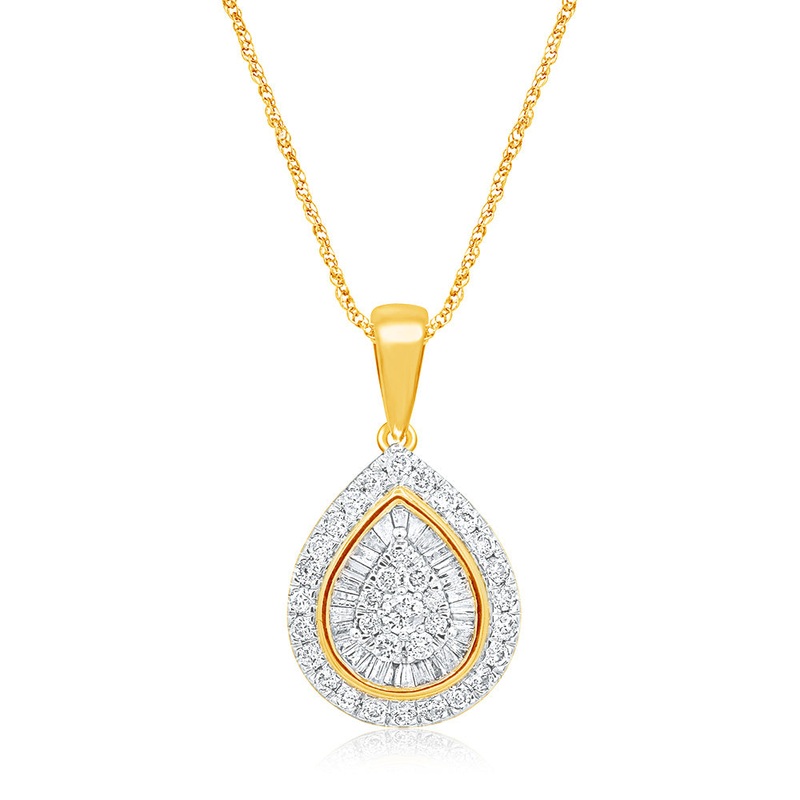 Dazzle and delight with this 9ct Yellow Gold 1 Carat Diamond Pear Shape Pendant with 62 Diamonds on 9ct 45cm Chain. This gorgeous piece is coated in diamonds, from round brilliant shapes, to the longer baguette cut. The use of layering and different styles