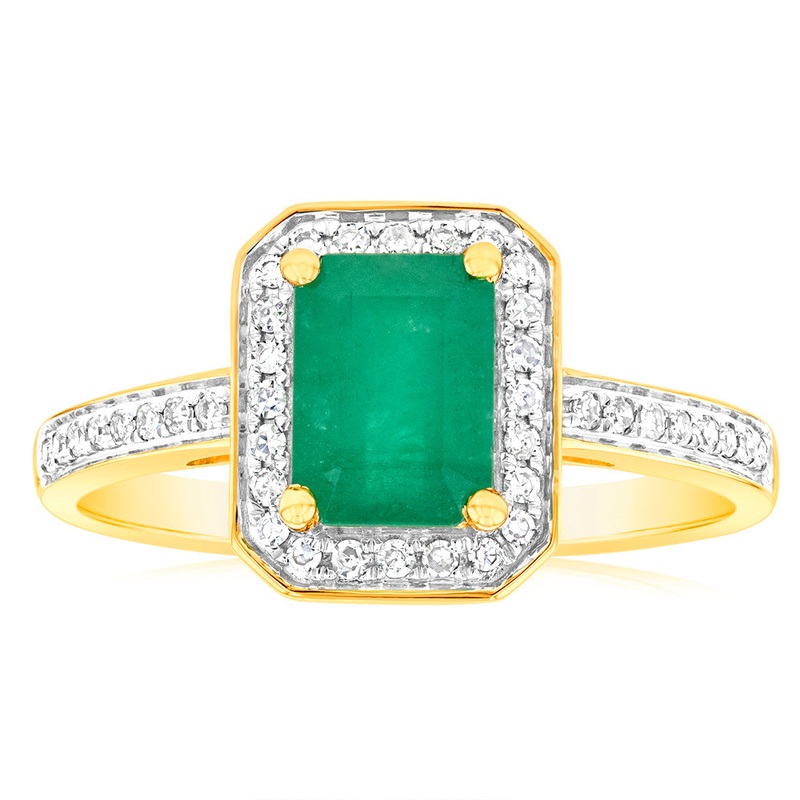 With a stunning natural emerald surrounded by sparkling diamonds, this ring is what dreams are made of. Crafted in 9ct yellow gold. Please contact us regarding special order enquiries for this ring. All ring sizes can be specially ordered, with delivery approximately 6-8 weeks.