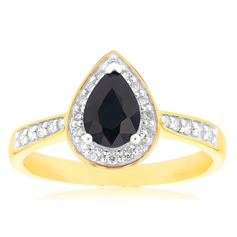 9ct Yellow Gold 1ct Natural Sapphire and 1/5 Carat Diamond Pear Halo Ring