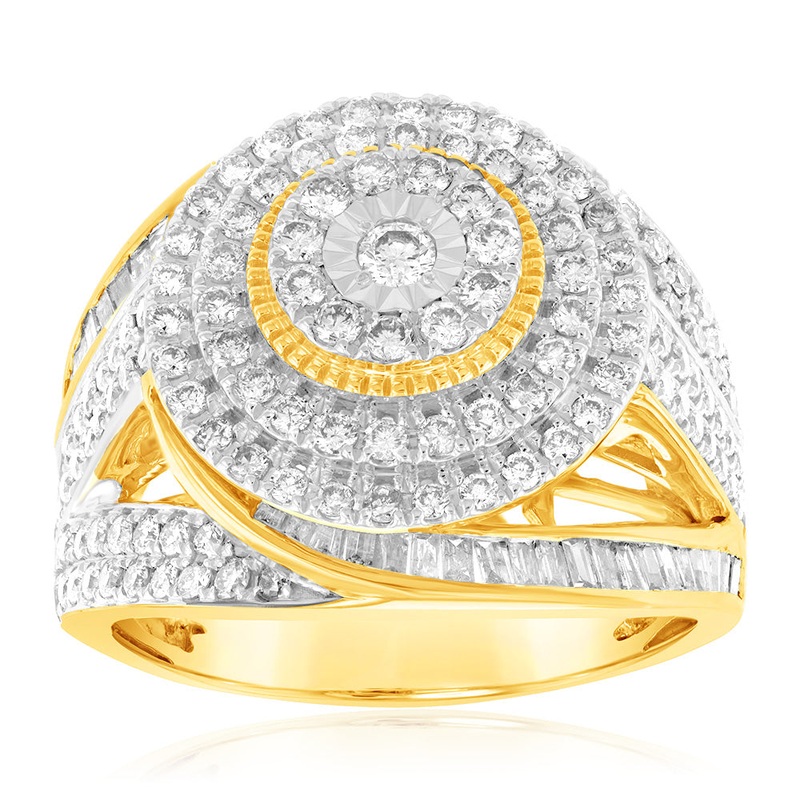 Elevate your elegance with our 9ct Yellow Gold 2 Carat Diamond Dress Ring, showcasing brilliant and baguette diamonds. This exquisite piece is a testament to sophistication and luxury, making a statement that will mesmerise and captivate all who see it.