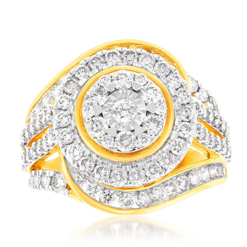 This stunning 2 Carat diamond ring has been designed with a big 3 Carat look. With 99 brilliant cut diamonds, this ring really does sparkle from every angle. You will love to wear this ring with a comfort feel and eye catching appeal.