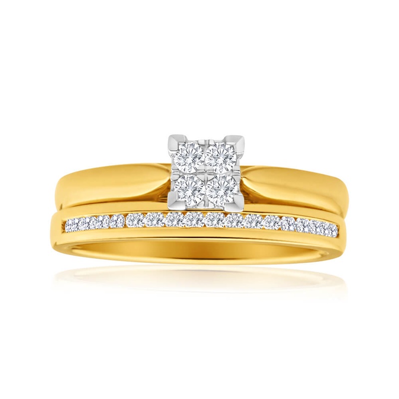 A stunning 9ct Yellow Gold 2 Ring Bridal Set With 22 Diamonds Totalling 0.25 Carats to show your love forever. This set contains an engagement ring and wedding band, each crafted from long-lasting 9ct yellow gold and paired with sparkling diamonds. The engagement ring holds a white gold basket setting with 4 brilliant cut diamonds, while the wedding band has a luxurious channel of diamonds. Both pieces fit perfectly together, each having their own unique charm and beautiful look.