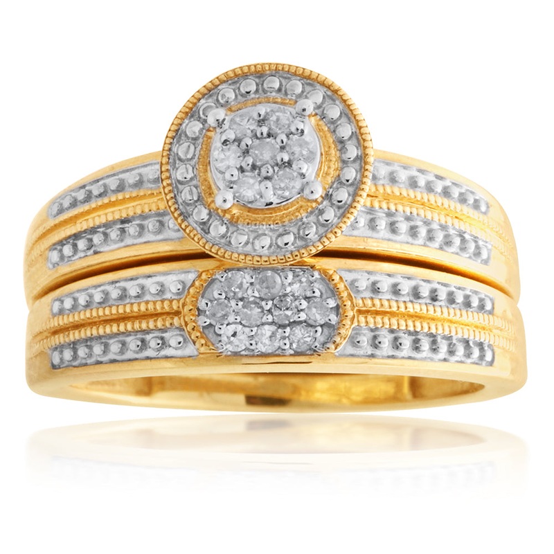 This 9ct Yellow Gold 2-Ring Diamond Bridal set with 17 Diamonds is a gorgeous alternative design. Containing an engagement ring and wedding band, this amazing pair melds together beautifully when worn together. Each piece is set with a cluster of shimmering diamonds and offset by unique white gold beading. 9ct yellow gold adds a rich, colourful contrast to either piece, and ties the look together perfectly.