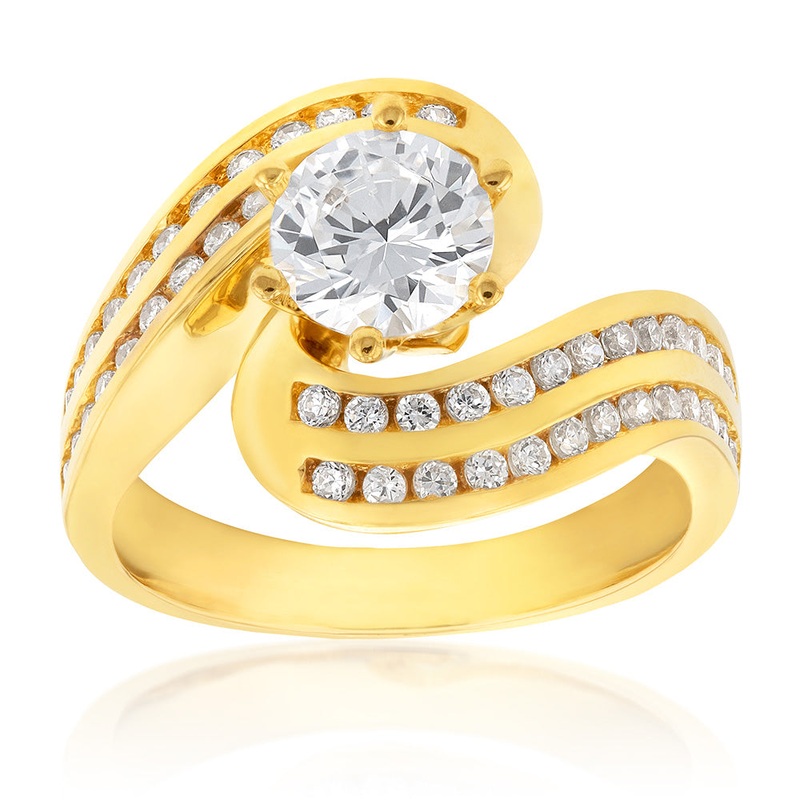 Embrace beauty in this stunning 9ct Yellow Gold Double Row CZ Solitaire Twist Ring. Crafted in beautiful 9ct yellow gold with a smooth finish and shiny lustre, this ring is perfect for all day wear. The swirl design frames the stone beautifully and creates a wonderful look. The shank is embellished with a channel setting that is complete with sparkling cubic zirconias. The centre stone also features a wonderful cz stone that glitters wonderfully and creates an amazing look.