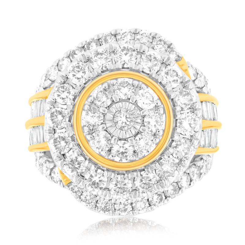 Gift yourself something precious in the form of a 9ct Yellow Gold 3.05 Carat Diamond Ring with Brilliant and Tapered Baguette Diamonds. The combination of gold, diamonds and tapered baguette diamonds makes this ring a must have accessory in your jewellery
