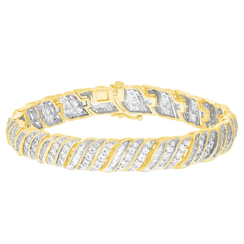 This 9ct Yellow Gold 5 Carat Diamond 18.5cm Bracelet with Brilliants and Baguettes is an utterly dazzling luxury statement. Coated in a vast expanse of round brilliant and lengthened baguette cut diamonds, this glitzy piece will make you stand out wherever