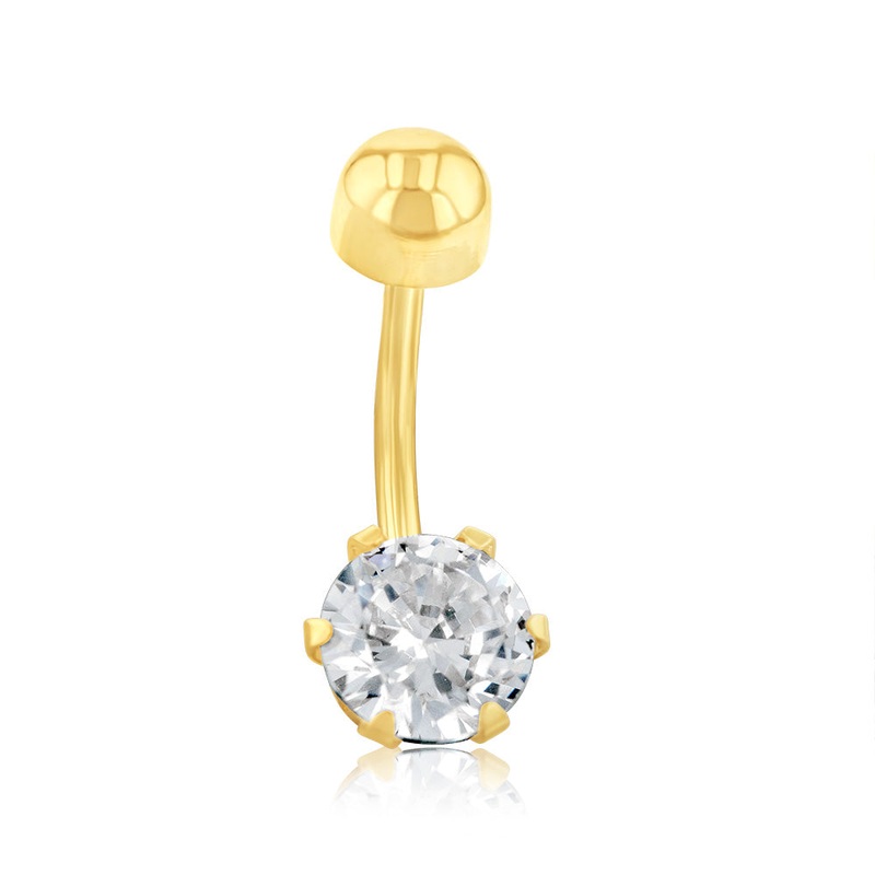 Elegant and eye-catching, this 9ct Yellow Gold 6mm Round Cubic Zirconia 6 Claw Belly Bar is the perfect accessory for any activity. Whether youre wearing a poolside outfit or a party dress, this belly bar will show off your glamorous side. Coated with time