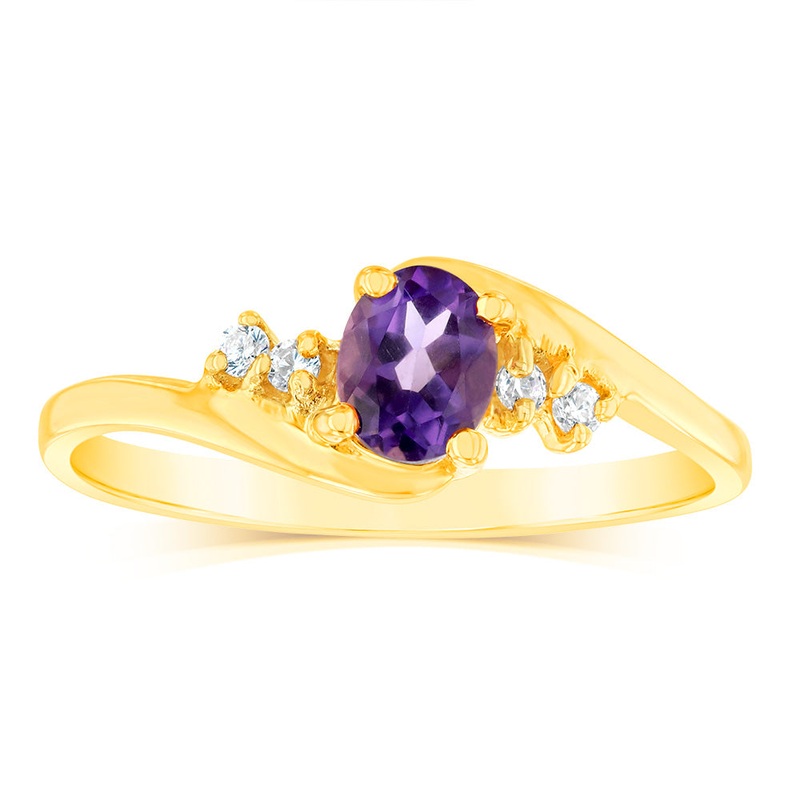 Timeless and classic, this 9ct Yellow Gold Amethyst and Cubic Zirconia Swirl Ring will never go unnoticed. Being birthstone inspired, the captivating violet hue of amethyst is the epitome of faithfulness and love. The glow from the tiny stones strike with