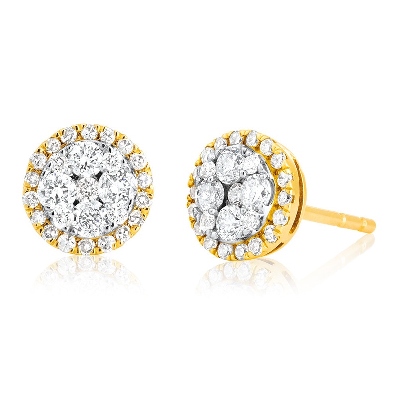 These sparkling 1/2 carat diamond stud earrings are sure to please. The stunning earrings feature brilliant cut diamonds in a cluster-style setting. Crafted in 9ct yellow gold.