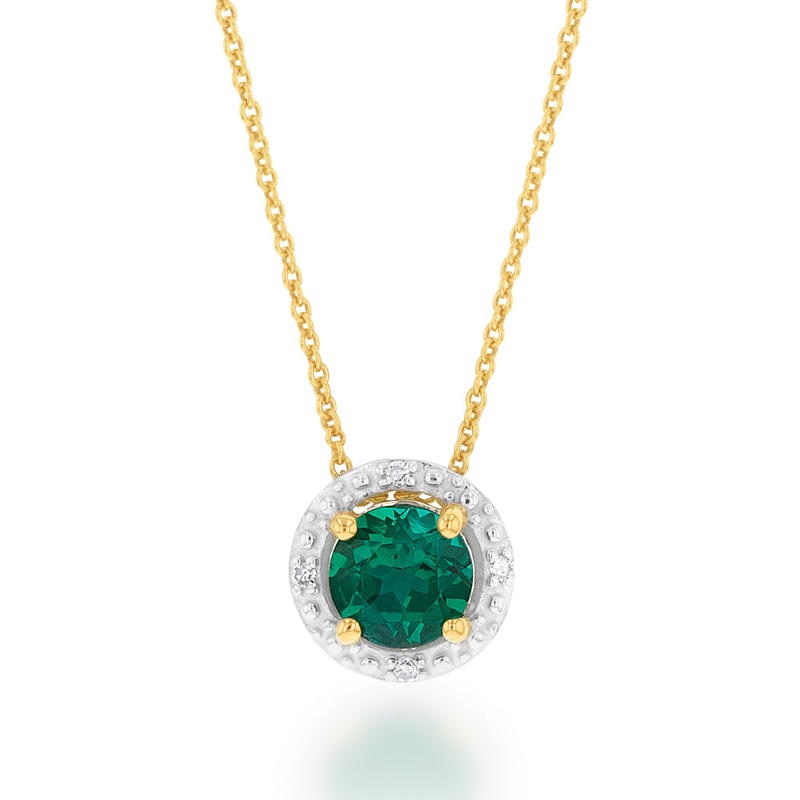 Channel the symbolism of growth and life with this 9ct Yellow Gold 5mm Created Emerald and Diamond Halo Pendant on 45cm Chain. This created stone is a true emerald, and grown from a seed of the precious stone. The clarity and deep green colour of this bril