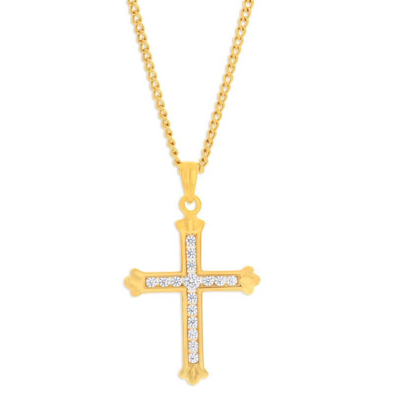This gorgeous 9ct Yellow Gold Cubic Zirconia 18mm Fancy Cross Pendant will be a beautiful way to show commitment and devotion to your faith. The cross symbol is a cherished design that many people wear everyday. This pendant is crafted in the warm tones of