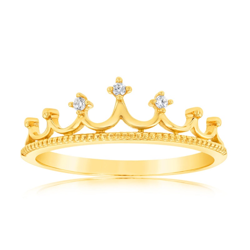 Elevate your style with our 9ct Yellow Gold Cubic Zirconia Crown Ring, a true masterpiece that exudes elegance and regal charm. Meticulously crafted from high-quality 9 carat yellow gold, this ring boasts a mesmerising crown design that is sure to capture