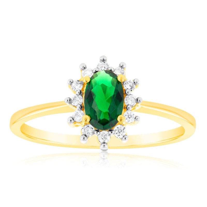 9ct Yellow Gold Diamond And Glass Filled Emerald Ring