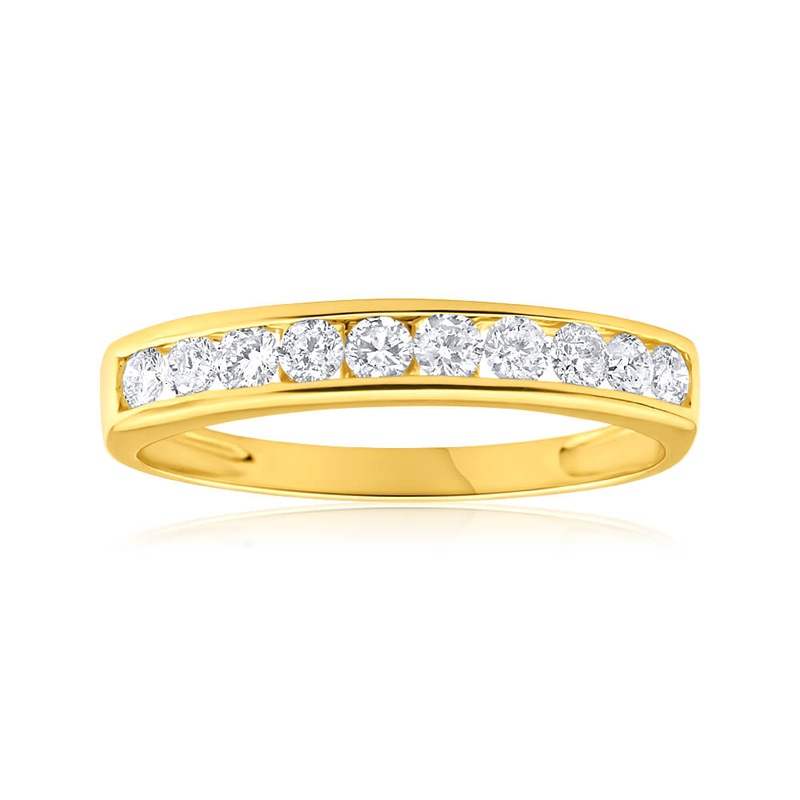 Glittering perfection starts here with this stunning 9ct Yellow Gold Diamond Ring Set with 10 Brilliant Cut Diamonds. Crafted in the warm tones of yellow gold with a smooth finish and shiny lustre, this ring is as high quality as it is beautiful. The ring is set with 10 brilliant cut diamonds in a channel setting, keeping the diamonds safe and sound, while letting them dazzle from every angle. Wear this band as an eternity band to symbolise your love and commitment, or wear it as a dress ring that elevates your everyday look.
