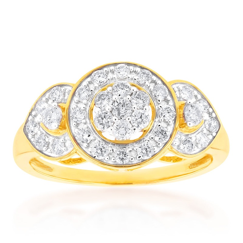 A 9ct Yellow Gold Diamond Ring Set With 31 Brilliant Cut Diamonds to delight and dazzle. Filled with never-ending diamond sparkle, this ring is perfect for someone who loves to look glamorous. Three circular diamond halos rest atop this stunning ring, creating eye-catching shape and depth. This is the perfect ring to wear on life’s special occasions.