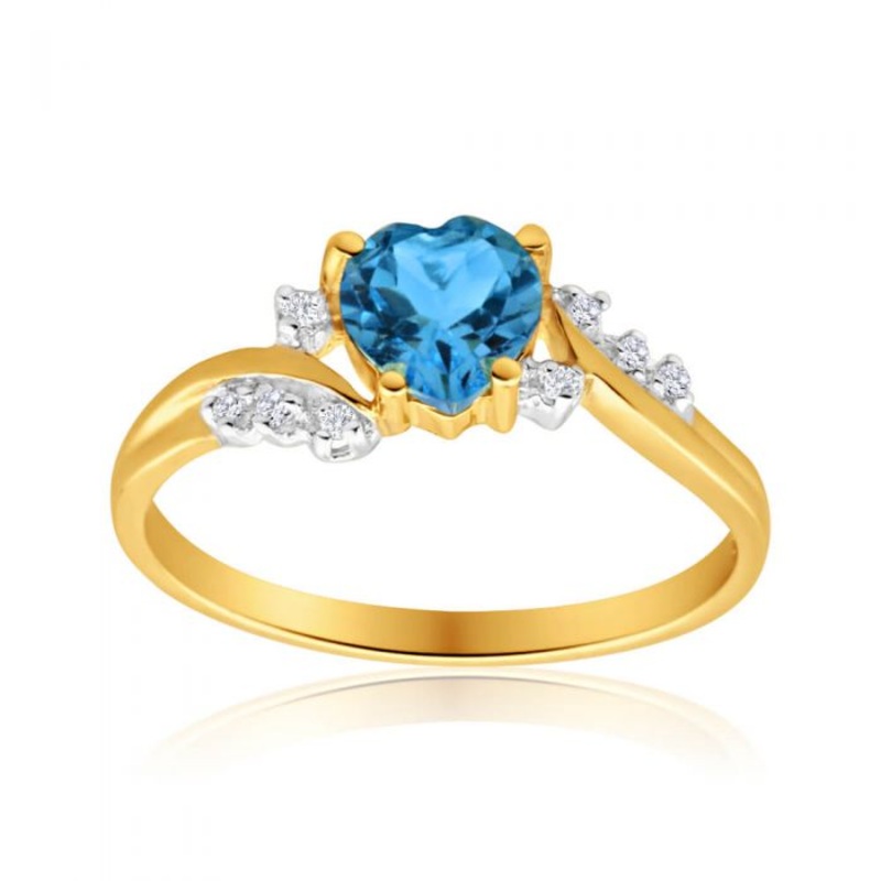This sparkling ring is perfectly unique. With a heart-shaped blue topaz, the 9ct yellow gold ring is surrounded by luscious diamonds.