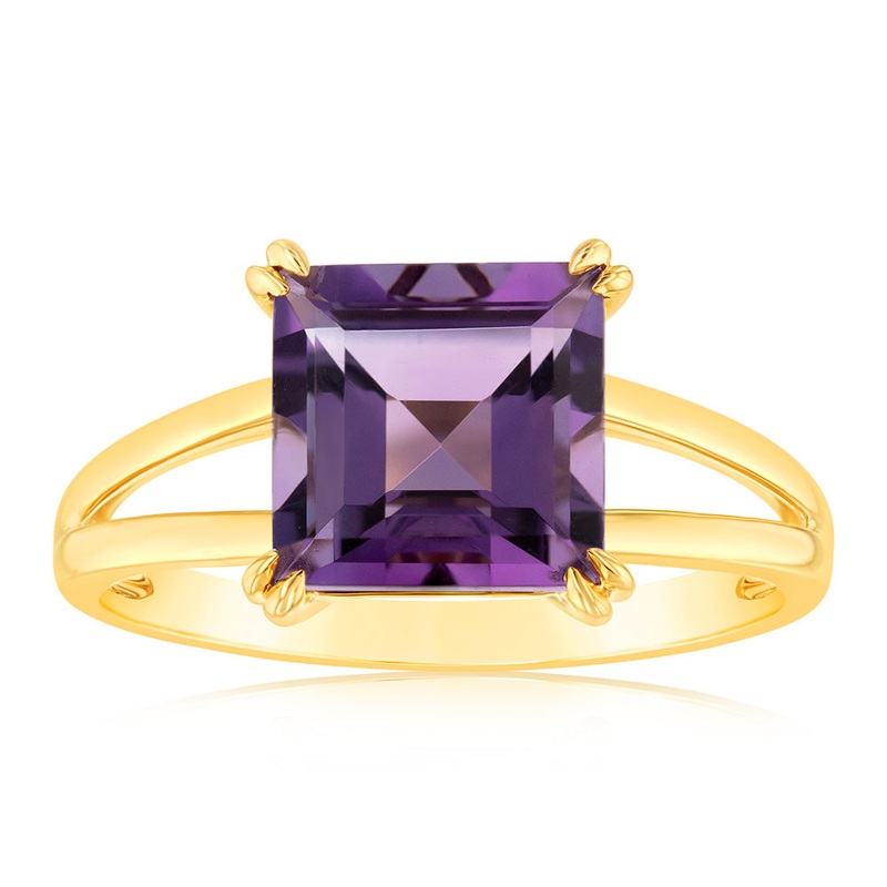 9ct Yellow Gold Natural Amethyst Ascher Cut Claw Set Ring with Split Shank